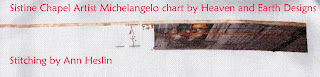And two more Heaven and Earth charts I purchased. I actually have the Sistine Chapel piece in progress but I am somewhat unhappy with this chart as it should have been through some editing in the photo before even begining to be made into a chart. There is a section of the top of the side wall that is included in this chart that really should not be there and is causing a waste of time in stitching as it does look very much out of place. I am extremely dissapointed that this was not both edited better nor was there a test stitching done by the people at Heaven and Earth Designs before marketing this chart. Had they tested the chart first, they would have seen their error right away. I am now debating as to whether I will ever bother to complete the entire design chart.